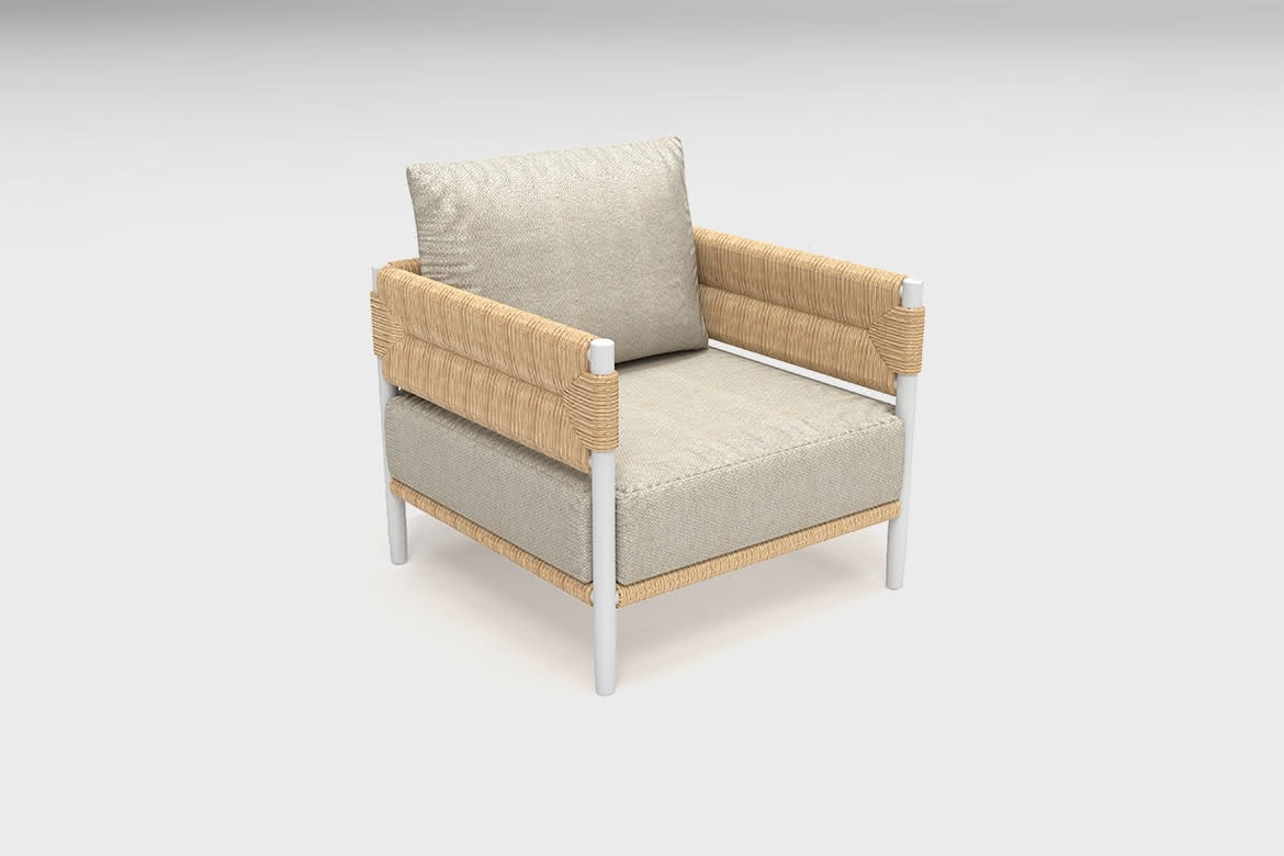 Composed of armchairs, sofa, coffee table, and side table, Stipa offers a generous and cocoon-like seating experience. Straw-style woven seats and backrests, inspired by Mediterranean craftsmanship, invite conviviality and sun-drenched relaxation.