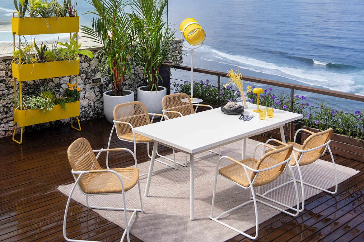 Le design épuré de la collection Slim est une véritable prouesse technologique : Maiori a su combiner un assemblage de profilés en aluminium, à la fois nombreux et de petit diamètre, tout en assurant une solidité parfaite. Les deux modèles sont empilables. L’assise et le dossier sont tissés d’une fibre PE ultra-fine à motif ouvert, garantissant un confort optimal sans besoin de coussin. Le fauteuil bas et la chaise de repas à pieds traîneaux offrent ainsi une utilisation polyvalente, parfaitement adaptées à tous les types de terrain.