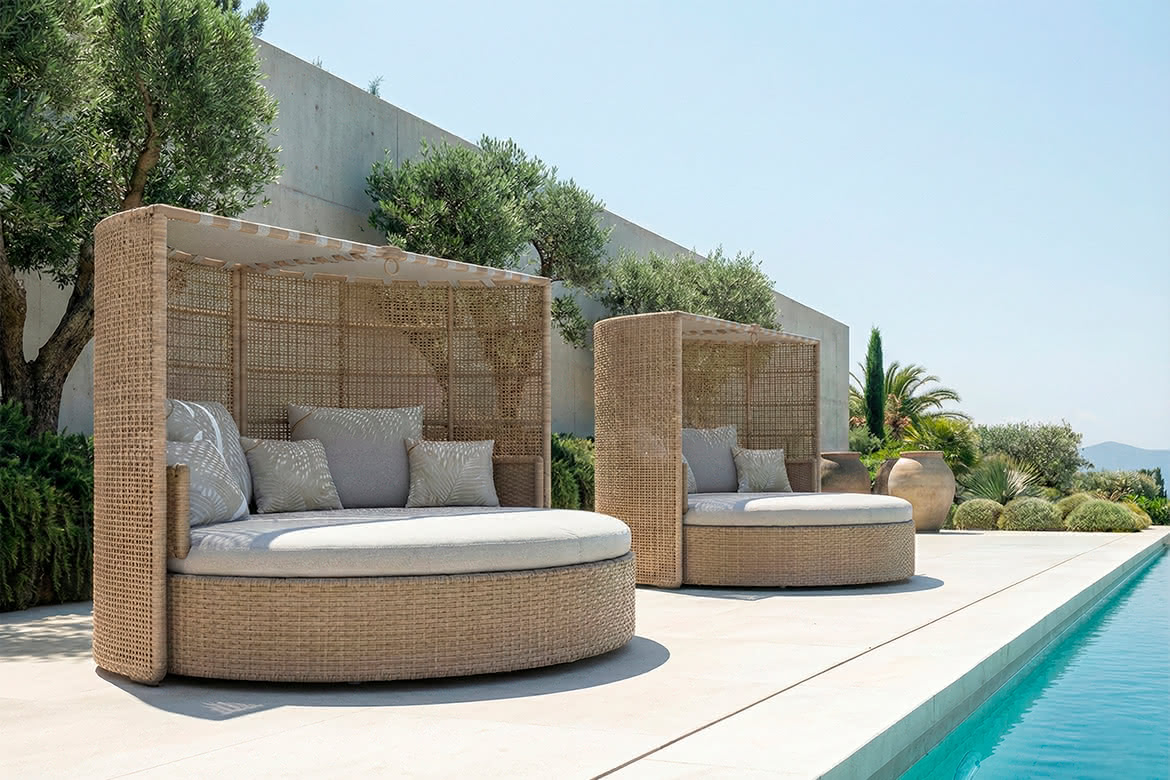 Le lit Eclipse allie tressage artisanal raffiné et design ingénieux, transformant terrasses, bords de piscine ou plages privées en espaces lounge exclusifs.