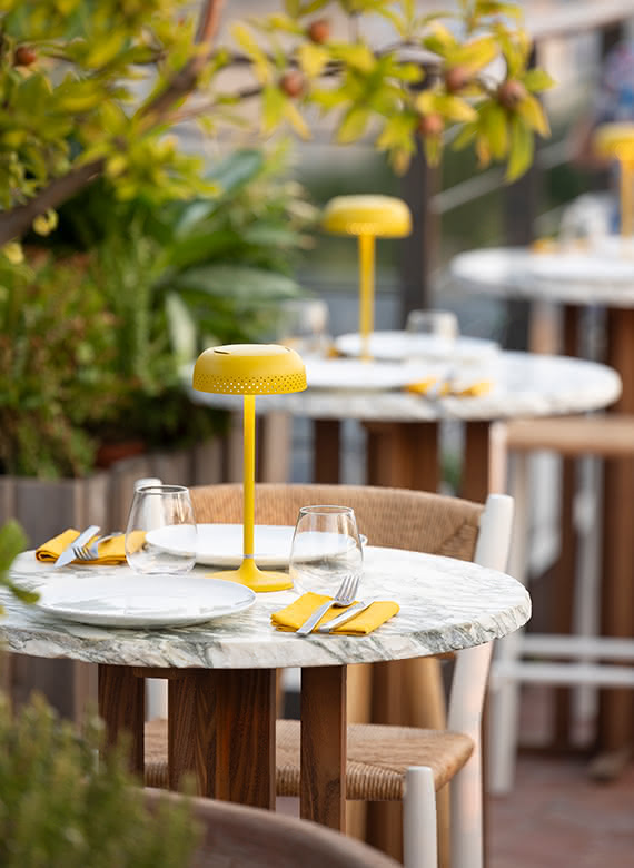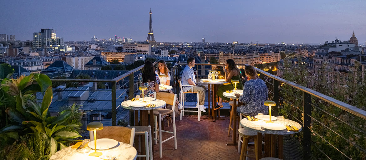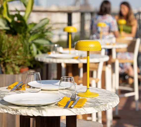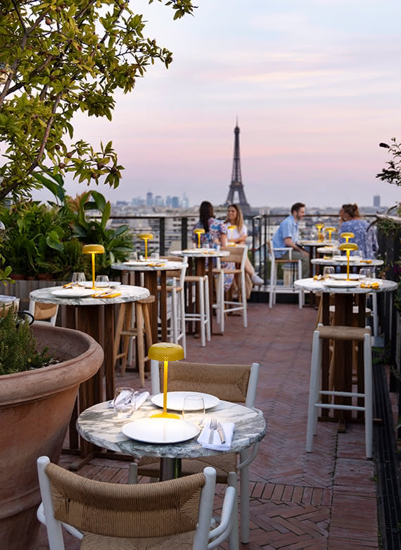 fr.Sur le rooftop de la Villa M, avec une vue imprenable sur la Tour Eiffel, les lampes LIDO moutarde et les chaises et tabourets de la collection STIPA s’imposent avec élégance, alliant confort et style.