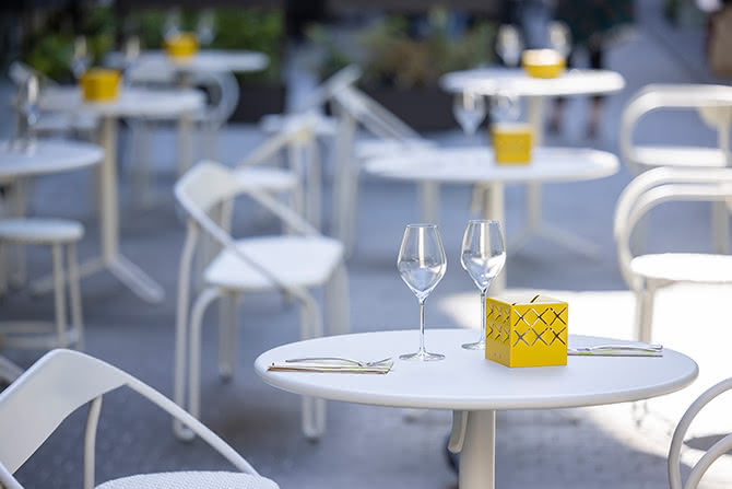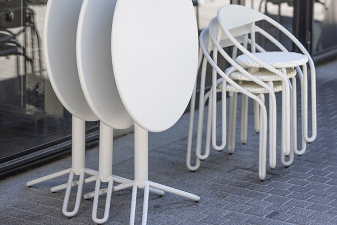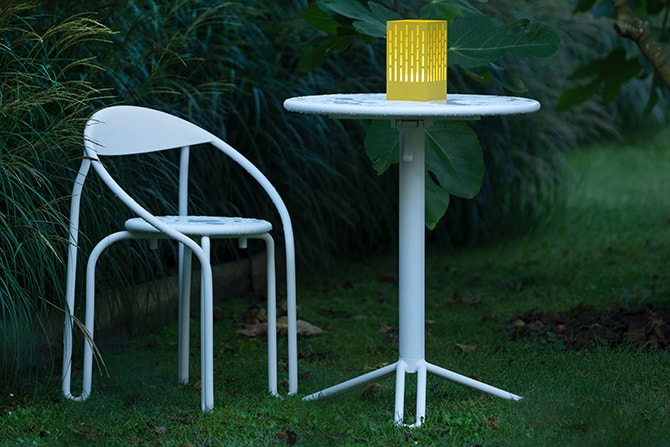 The Huggy bistro table is perfect when sided by two armchairs, and works flawlessly in a terrace thanks to its small 60 cm of diameter size. Every Huggy piece is designed as a continuum of each other. Based on a continued curve that draws the object and gives it its unique function within the range. The table top is foldable with an easy to use lock system and to optimize the storage.