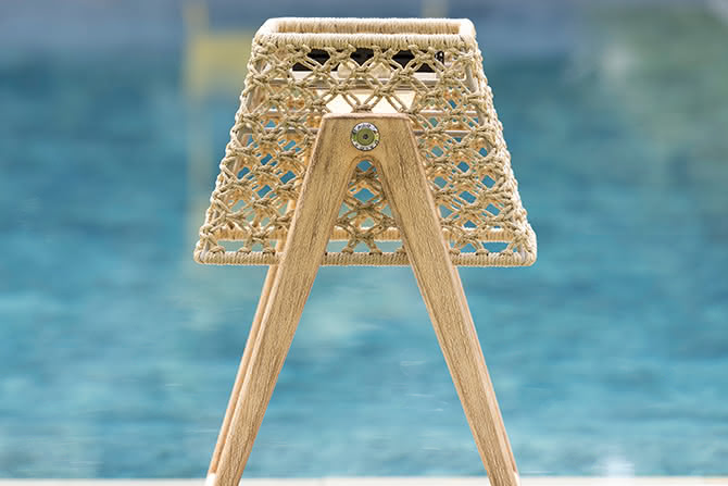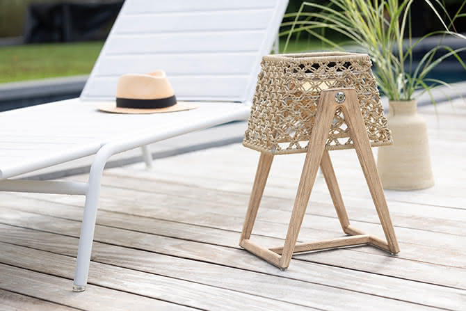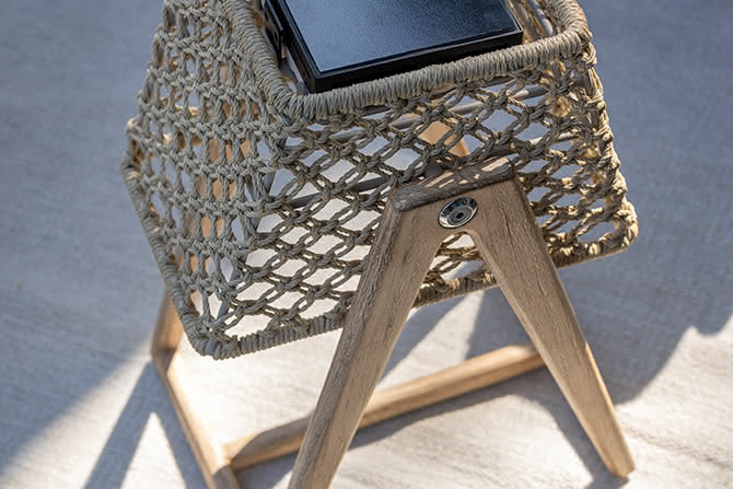 Made from a teak structure and topped with an articulated woven rope shade, this lamp features a hybrid solar LED module for indoor and outdoor use!