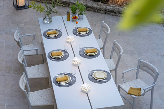 Stipa Aluminium tables are single material designs conceived for extensive outdoor use. made from recyclable aluminium T6 and finished with a layer of trademark powder coating paint, these are tables built to last and perform in any weather condition.